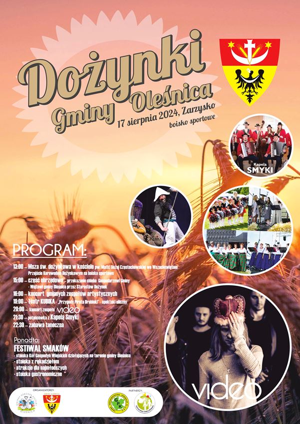 W tradycyjnej części obrzędowej w wykonaniu zespołów ludowych – Wójtowi Gminy Oleśnica zostanie przekazany chleb dożynkowy przez starostów dożynek. Następnie na scenie zaprezentują się gminne zespoły ludowe. Ze swoim spektaklem o 19 wystąpi również Teatr KUBIKA, przedstawiając ,,Przygody Pirata Drabinki”. Na scenie o godz. 20 pojawi się gwiazda wieczoru – zespół Video – autorzy takich hitów jak „Papieros”, „Środa czwartek”, „Wszystko jedno” czy „Ktoś Nowy”. Ich piosenki zdobyły serca wielu słuchaczy i regularnie grane są w stacjach radiowych.