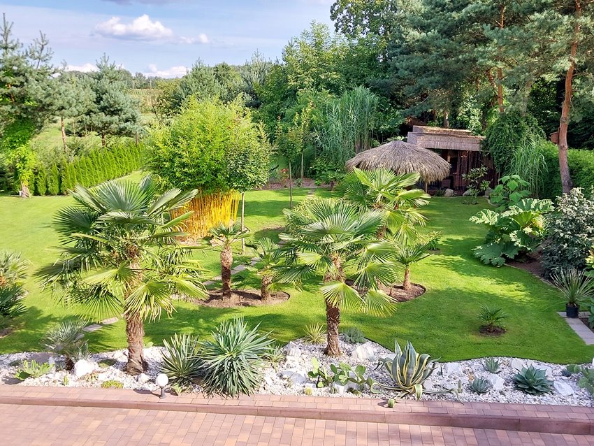 Na terenie, gdzie dzisiaj rosną między innymi palmy i bananowce, kiedyś był warzywniak. – Potrzeba było sporo pracy i zaangażowania, żeby zmienić pole w ogród – mówi pan Tomasz. – Posiałem trawę i zacząłem szukać roślin nietypowych, a że zawsze bardzo podobały mi się palmy, postawiłem właśnie na nie. Moja przygoda z egzotycznym ogrodem trwa już kilka lat i choć pielęgnacja takich roślin wymaga ciągłego pogłębiania wiedzy i bardzo dużo codziennej pracy, uważam, że warto.