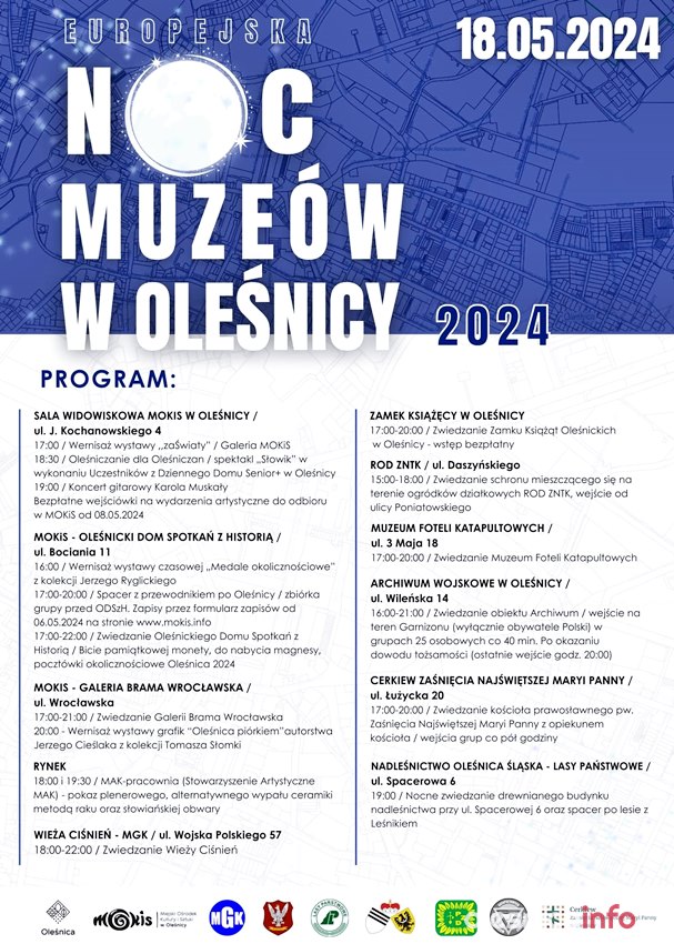 • 17:00-20:00 / Spacer z przewodnikiem po Oleśnicy / zbiórka grupy przed ODSzH Zapisy przez formularz zapisów od 06.05.2024 na stronie www.mokis.info