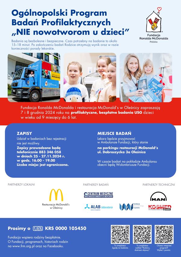 Fundacja Ronalda McDonalda zaprasza najmłodszych oleśniczan na badania