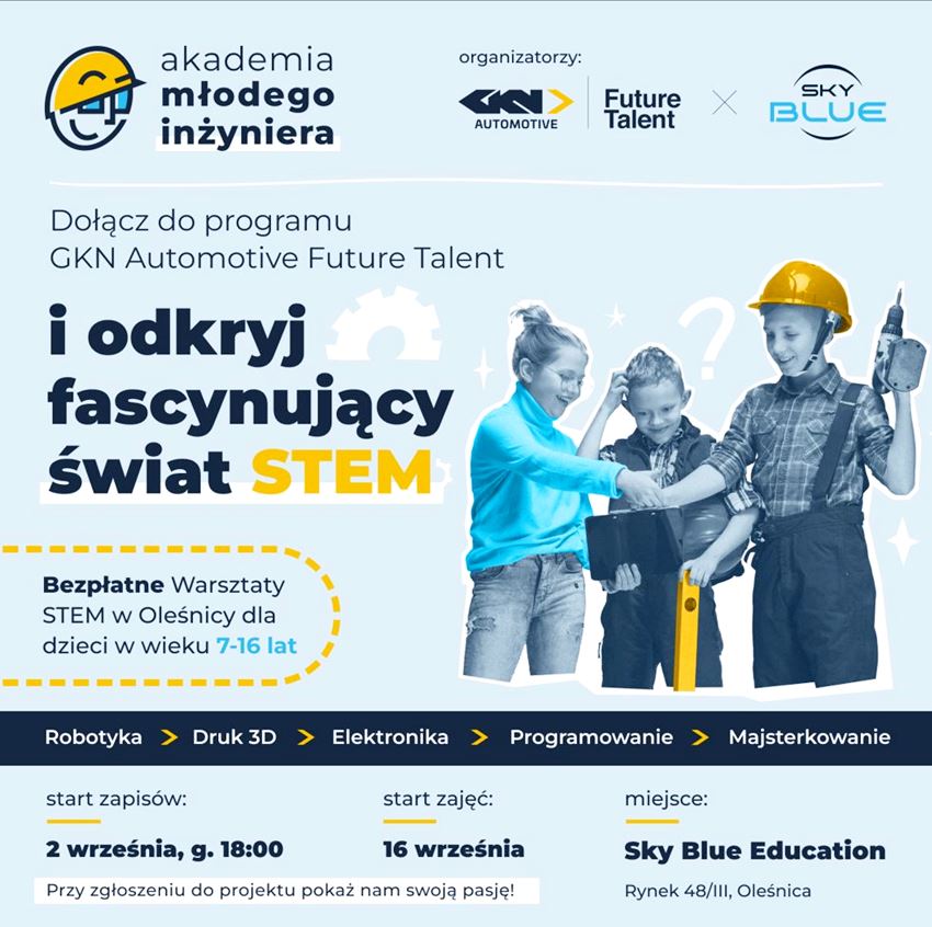 GKN Automotive Poland we współpracy z oleśnicką pracownią edukacyjną Sky Blue Education zaprasza dzieci i młodzież w wieku 7-16 lat z Oleśnicy i okolic do udziału w bezpłatnym projekcie edukacyjnym „Akademia Młodego Inżyniera” w ramach globalnego programu GKN Automotive Future Talent.