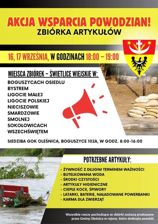 – Żywioł, który wdarł się do ich domów niszcząc infrastrukturę i utrudniając bądź uniemożliwiając im codzienne funkcjonowanie, zagraża ich życiu i zdrowiu – czytamy w komunikacie gminy Oleśnica. – W tych trudnych chwilach my też możemy pomóc poszkodowanym, dostarczając im niezbędnych do przetrwania rzeczy. W gminie Oleśnica w świetlicach wiejskich uruchomiliśmy zbiórki potrzebnych artykułów, które już w środę zostaną przez nas przekazane w rejony dotknięte powodzią.