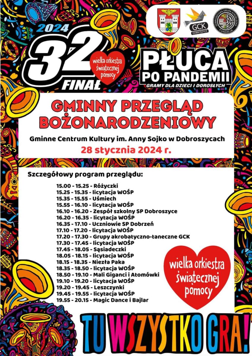 Dzisiaj o godzinie 15 w Dobroszycach odbędzie się Gminny Przegląd Bożonarodzeniowy. Występy zespołów działających w gminie Dobroszyce będą przeplatane licytacjami na rzecz Wielkiej Orkiestry Świątecznej Pomocy.
