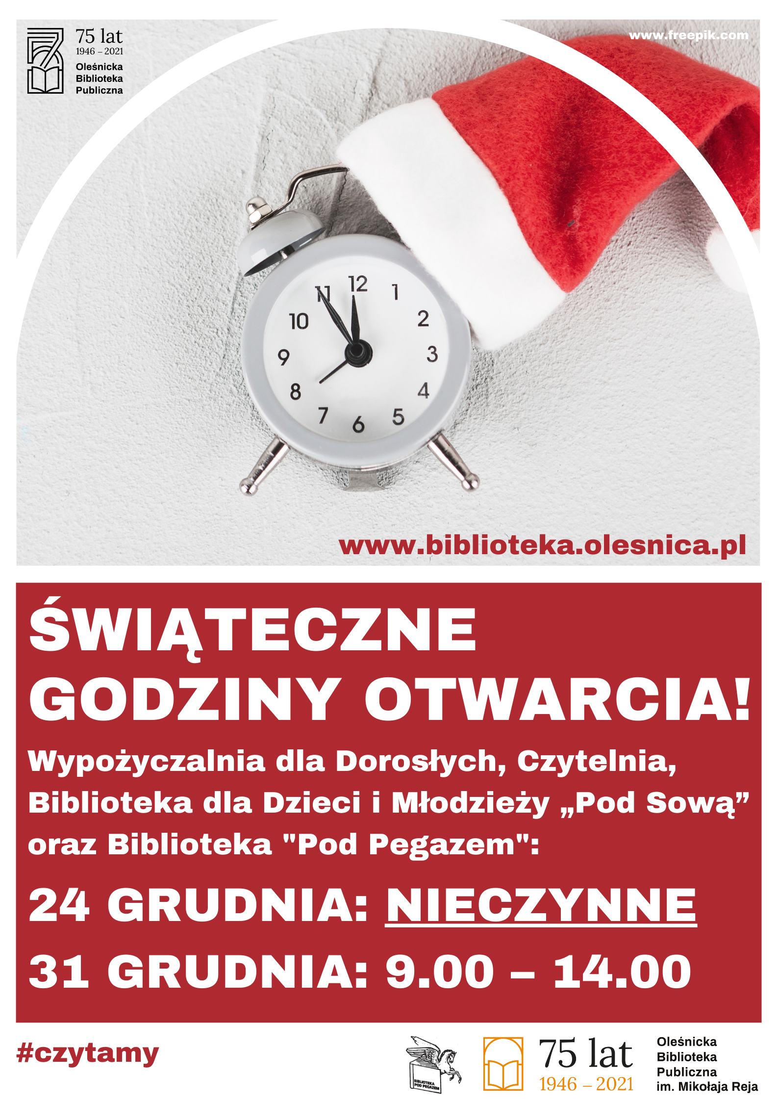 Oleśnicka Biblioteka Publiczna poinformowała o godzinach otwarcia w okresie świąt Bożego Narodzenia i Sylwestra.