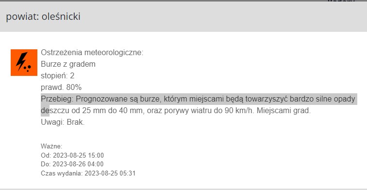 – Prognozowane są burze, którym miejscami będą towarzyszyć bardzo silne opady deszczu od 25 mm do 40 mm, oraz porywy wiatru do 90 km/h. Miejscami grad – informuje IMGW.
