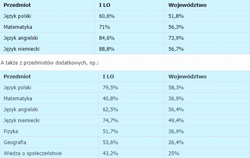 Kryteria brane pod uwagę przez Kapitułę podczas tworzenia Rankingu to wyniki maturalne z przedmiotów obowiązkowych, jak i dodatkowych oraz sukcesy szkoły w olimpiadach. Przypomnijmy, że w ubiegłym roku wszyscy uczniowie klas trzecich I LO przystąpili do egzaminu maturalnego uzyskując zdawalność na poziomie 98,7%. 27 uczniów zdało maturę z jednego przedmiotu na poziomie 100%. Na tak ogromny sukces złożyły się bardzo wysokie wyniki z przedmiotów obowiązkowych:
