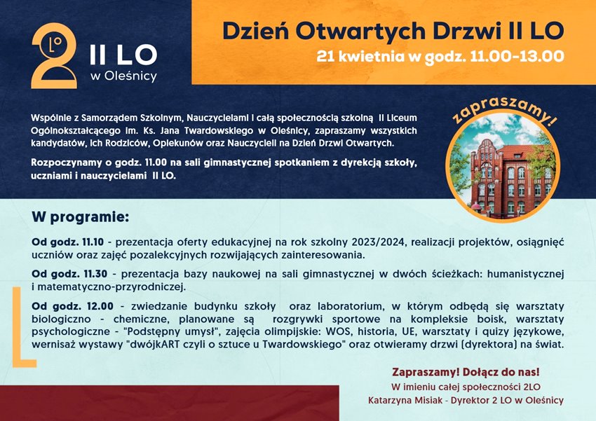 II Liceum Ogólnokształcące w Oleśnicy zaprasza na Dzień Otwarty