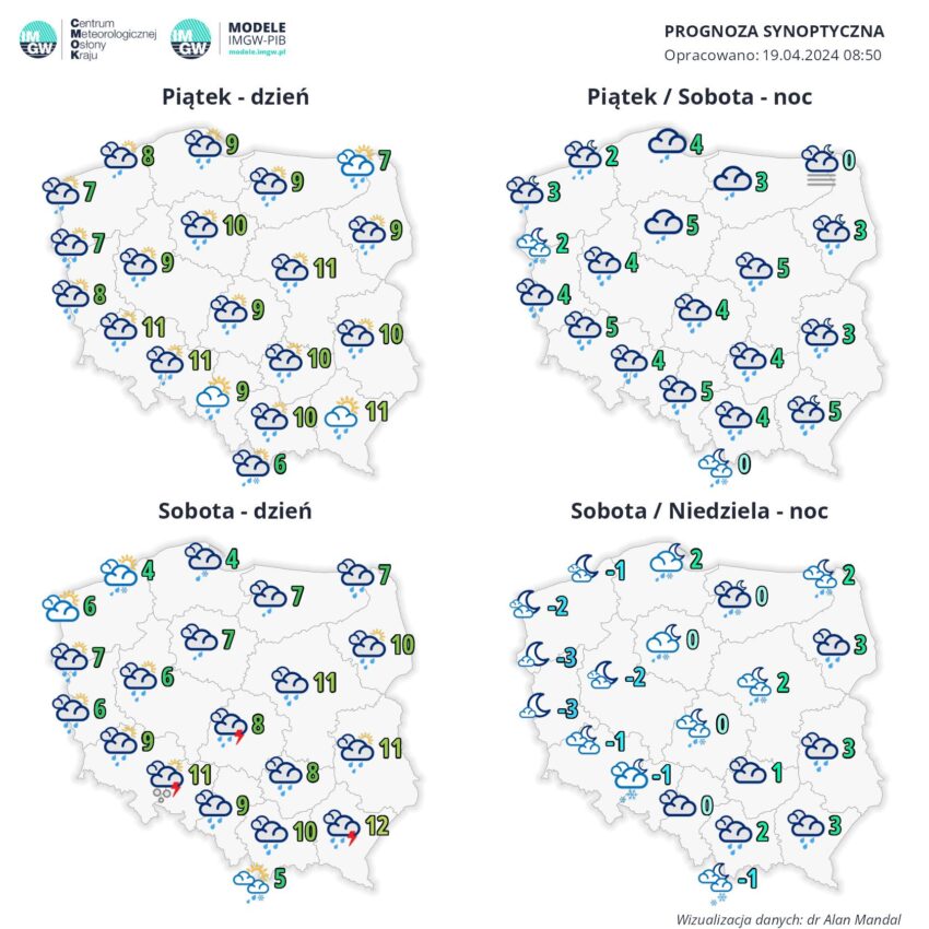 Weekend pochmurny z opadami deszczu, na północy i w górach deszczu ze śniegiem i śniegu; w sobotę na południowym wschodzie burze z opadami gradu lub krupy. Opady chwilami będą intensywne. Chłodno. Nocami spadki temperatury do –3°C i lokalnie przymrozki, w dzień od 3°C do 12°C. Na Wybrzeżu okresami dość silny i porywisty wiatr z kierunków zachodnich i północnych.