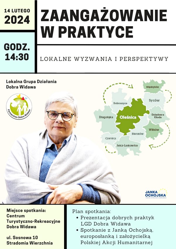 – Odwiedzi nas Janka Ochojska – od niemal 30 lat związana z sektorem pozarządowym – informuje Dobra Widawa. – Opowiemy o działalności LGD, lokalnych liderach, ciekawych inicjatywach dofinansowanych przez nasze Stowarzyszenie oraz o kolejnych możliwościach rozwoju naszego regionu w ramach Lokalnej Strategii Rozwoju na lata 2023-2027.
