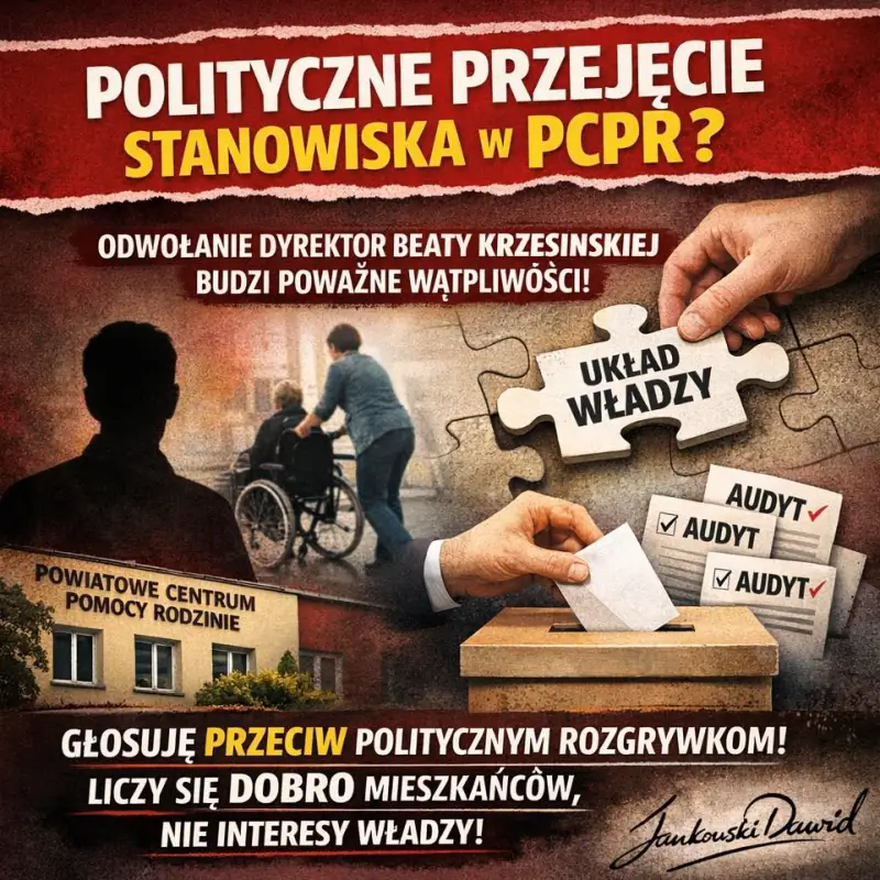– Sprawa odwołania dyrektor Powiatowego Centrum Pomocy Rodzinie w Oleśnicy budzi poważne wątpliwości. Wiele wskazuje na to, że nie chodzi o rzetelną ocenę pracy instytucji ani dobro jej podopiecznych, lecz o polityczne przejęcie stanowiska i obsadzenie go osobą związaną z obecnym układem władzy – uważa Jankowski. – PCPR to instytucja służąca osobom najsłabszym, wymagająca stabilności i zaufania społecznego. Pani Beata Krzesińska takie zaufanie posiada – jest ceniona przez mieszkańców, a jej odwołanie sprawia wrażenie decyzji motywowanej politycznie, do której audyt stanowi jedynie uzasadnienie.