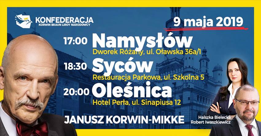 Januszowi Korwin-Mikke towarzyszyć będzie europoseł Robert Iwaszkiewicz oraz Halszka Bielecka z Partii Kierowców. – Zabierz koniecznie osoby niezdecydowane, by mogły dowiedzieć się więcej o programie Konfederacji. Po wystąpieniach prelegentów będziesz miał okazję na zrobienie pamiątkowego zdjęcia z Panem Prezesem – zachęcają organizatorzy.