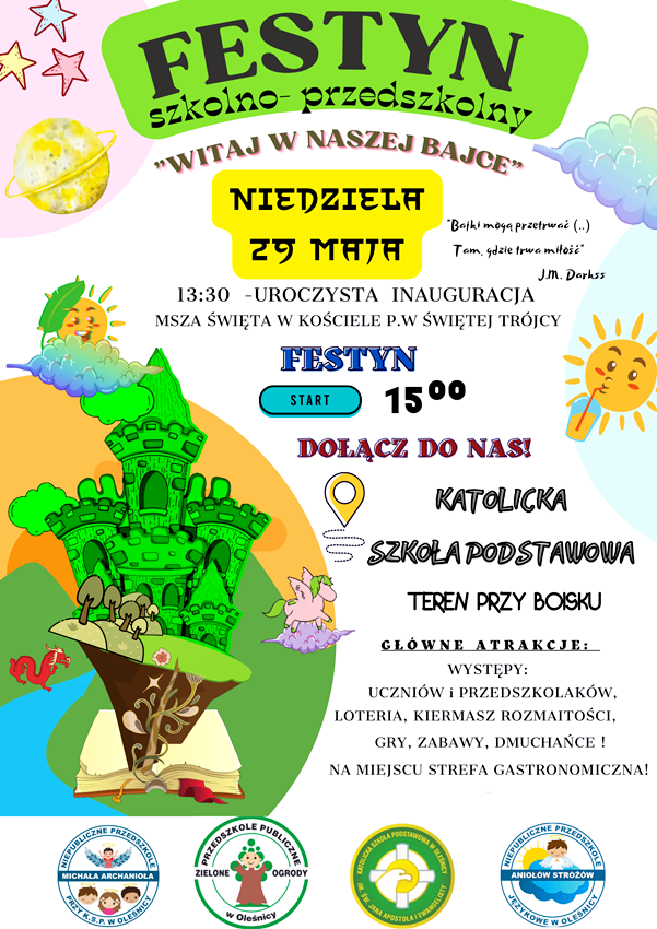 Festyn poprzedzi uroczysta inauguracja w kościele świętej Trójcy na ul. Łużyckiej 4 o godz. 13.30. Impreza rozpocznie się o godzinie 15 na terenie boiska przy Katolickiej Szkole Podstawowej w Oleśnicy na ul. Północnej 16. – Zaplanowaliśmy liczne atrakcje dla najmłodszych i nie tylko! Wszystkich chętnych do udziału w zabawie serdecznie zapraszamy. Wstęp jest wolny – zapraszają organizatorzy.