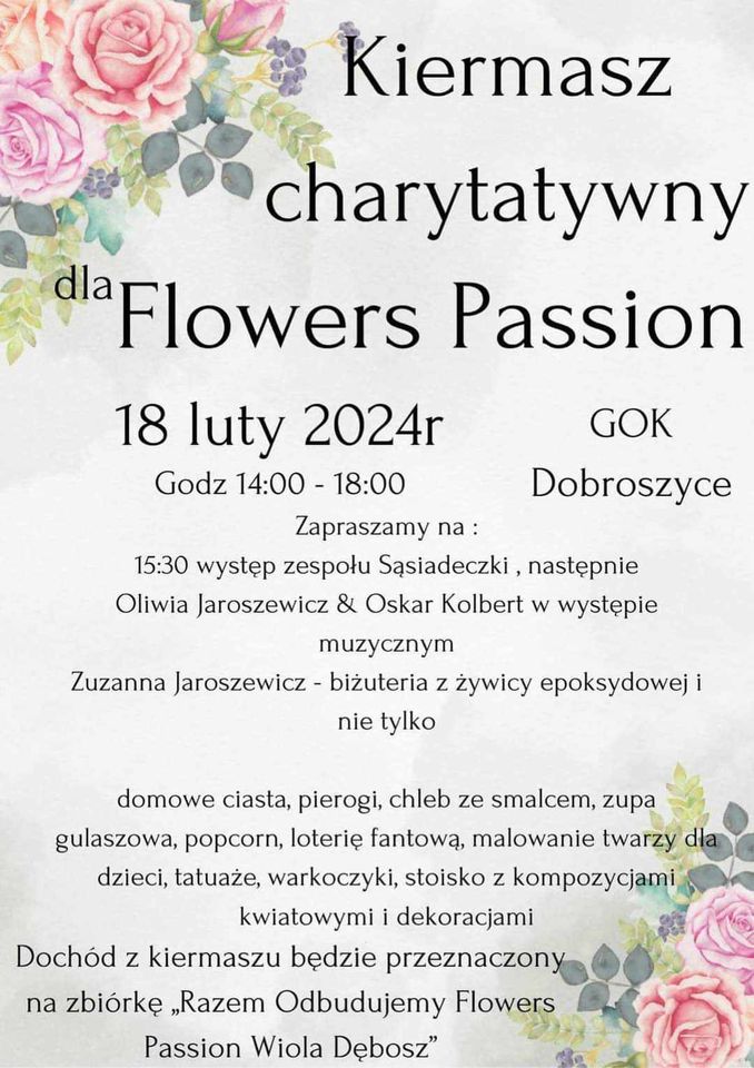 18 lutego w Dobroszycach przy ulicy Parkowej 14 odbędzie się kiermasz, z którego dochód będzie przeznaczony na odbudowanie Flowers Passion Wioletty Dębosz, sklepu z dekoracjami do domu oraz tekstyliami, które spłonął 20 stycznia tego roku.