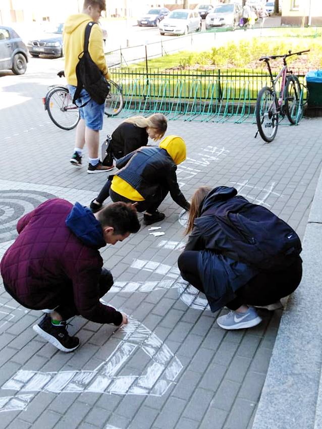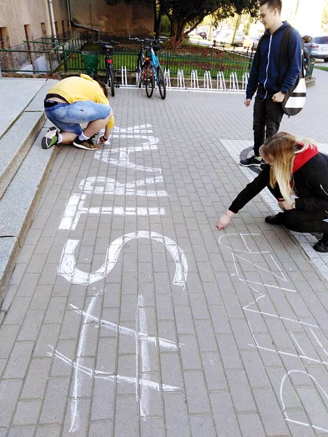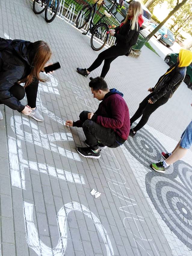 Uczniowie odwiedzili nauczycieli, ale też wykonali napis przed budynkiem liceum: Strajk. Murem za nauczycielami.