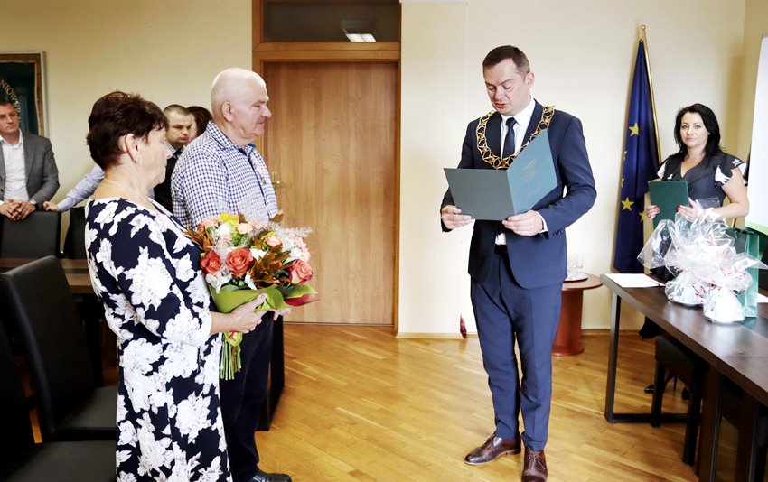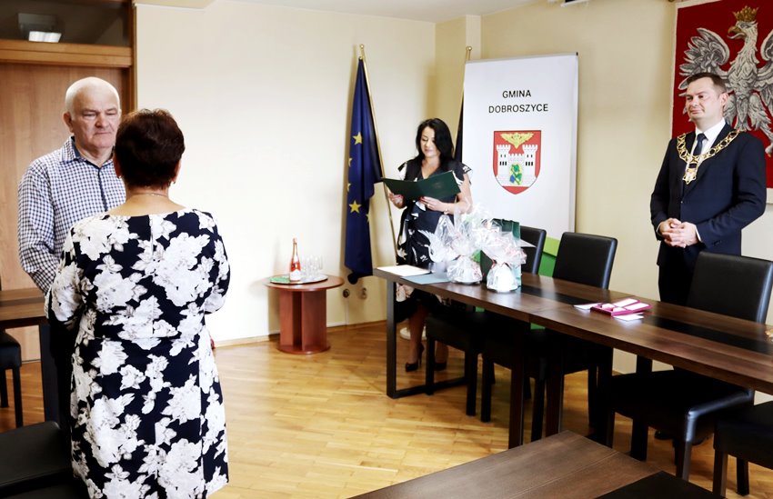 Uroczystość poprowadziła sekretarz Monika Hołówka. Uroczystego aktu dekoracji dokonał wójt Artur Ciosek wręczając jubilatom legitymacje oraz Medale za Długoletnie Pożycie Małżeńskie, przyznane przez Prezydenta Rzeczpospolitej Polskiej.