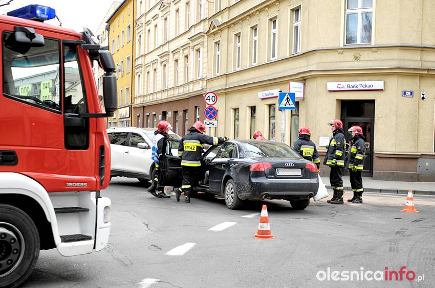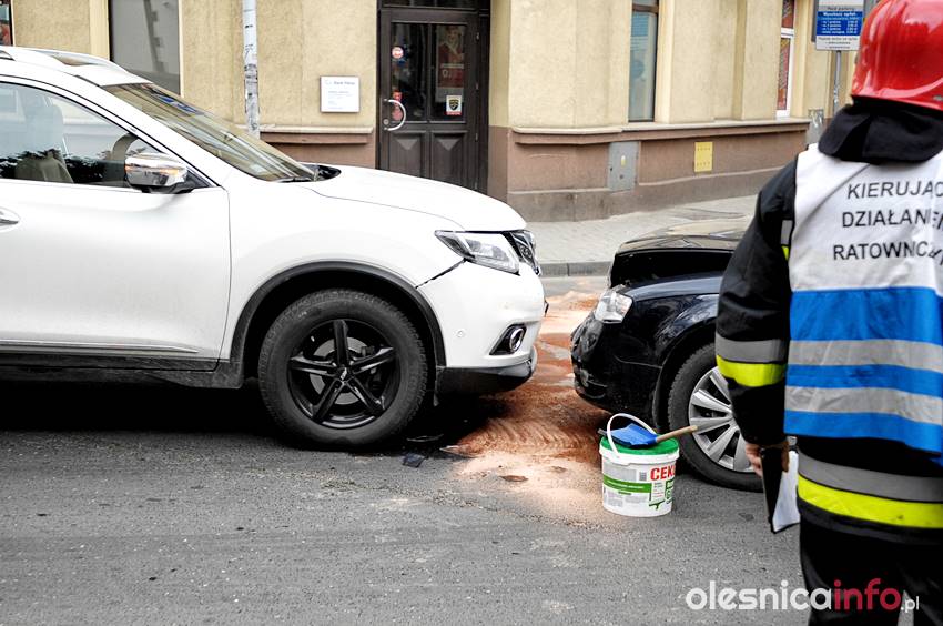 W kolizji udział wzięły dwa osobowe auta – nissan i audi. Audi jadące od Rynku w stronę 3 Maja zostało uderzone przez nissana, którego kierowca prawdopodobnie wymusił pierwszeństwo. Ulica jest częściowo nieprzejezdna. Na miejscu interweniują służby, w tym straż pożarna, która usuwa płyny z jezdni.