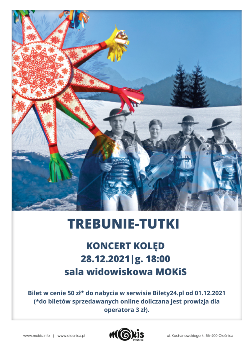 Miejski Ośrodek Kultury i Sztuki w Oleśnicy zaprasza 28 grudnia o godzinie 18 do sali widowiskowej na koncert kolęd w wykonaniu zespołu Trebunie-Tutki.