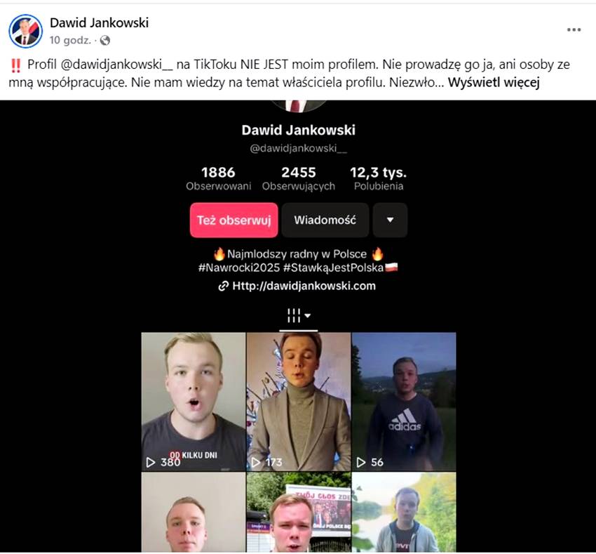 – Profil @dawidjankowski__ na TikToku NIE JEST moim profilem – wyjaśnia. – Nie prowadzę go ja, ani osoby ze mną współpracujące. Nie mam wiedzy na temat właściciela profilu. Niezwłocznie zgłoszę sprawę odpowiednim organom w celu wyjaśnienia sprawy, a także administratorom TikToka. Bardzo proszę, by nie odpisywać temu użytkownikowi, ani nie wchodzić w żadne linki wysyłane przez ten profil w wiadomościach prywatnych.