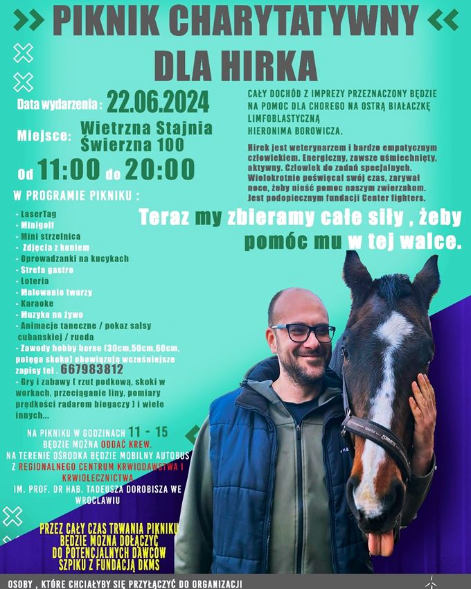 Hirek jest weterynarzem i bardzo empatycznym człowiekiem. Energiczny , zawsze uśmiechnięty, aktywny. Człowiek do zadań specjalnych. Wielokrotnie poświęcał swój czas, zarywał noce, żeby nieść pomoc naszym zwierzakom. Jest podopiecznym fundacji Center Fighters. Teraz my zbieramy całe siły , żeby pomóc mu w tej walce – tak o akcji i jej bohaterze piszą właściciele Wietrznej Stajni.