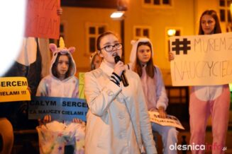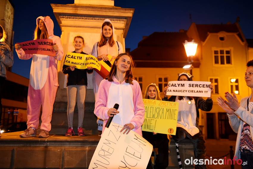 Przed zgromadzonymi na Rynku mieszkańcami wystąpili także młodzi oleśniczanie. – Mam w rodzinie bliską osobę pracującą w zawodzie nauczyciela – mówiła Ola, tegoroczna maturzystka. – Wiem, ile poświęcenia kosztuje ta praca. Wiem, ile wyrzeczeń kosztem rodziny, ile pracy. Wiem też, jak wiele zawdzięczam nauczycielom, jak dużą wiedzę posiadacie.
