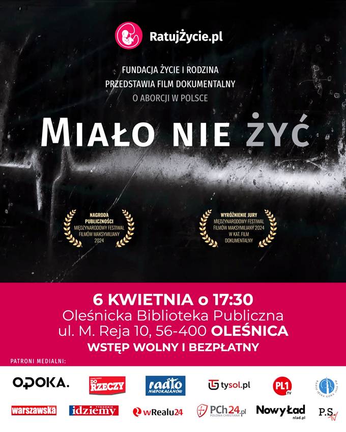 - W imieniu własnym oraz Prezes Fundacji Życie i Rodzina, Pani Kai Godek serdecznie zapraszam na projekcję filmu "Miało nie żyć" w najbliższą niedzielę, 6 kwietnia o godzinie 17:30 w bibliotece przy ul. Mikołaja Reja 10 w Oleśnicy - poinformował w mediach społecznościowych miejski radny PiS Dawid Jankowski.