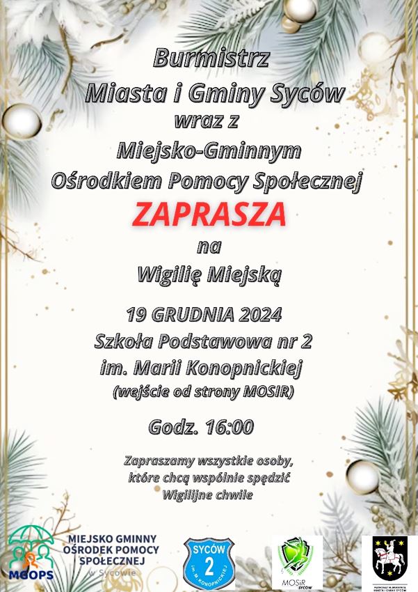 Miejsko-Gminny Ośrodek Pomocy Społecznej oraz burmistrz Łukasz Kuźmicz zapraszają na wigilię miejską, która odbędzie się 19 grudnia w Szkole Podstawowej nr 2 im. Marii Konopnickiej w Sycowie o godzinie 16.