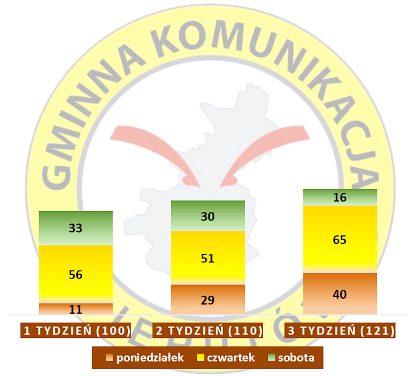 Burmistrz przedstawił wykres pokazujący liczbę przewiezionych pasażerów w pierwszych 3 tygodniach funkcjonowania, z podziałem na dni tygodnia.