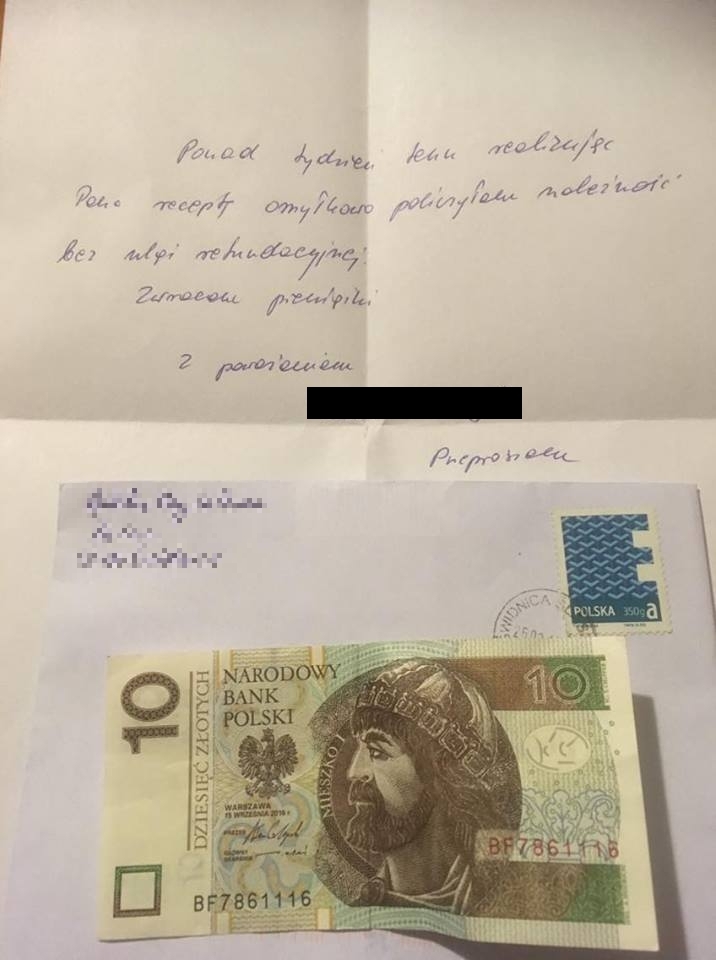 – Taki list dzisiaj otrzymałem ! Niesamowite– pisze pan Marek i załącza zdjęcie listu, a w nim słowa farmaceutki, która przeprasza, że nie odliczyła od ceny leku ulgi refundacyjnej. Do koperty włożyła 10 złotych.