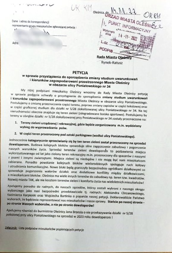 – Na ostatnim posiedzeniu komisji skarg, wniosków i petycji radny Marek Czarnecki (ORS) złożył wniosek, by petycję mieszkańców uznać za bezzasadną – pisze w mediach społecznościowych Bielański. – Wniosek poparli radni Ilona Brattig i Jan Mandat z klubu radnych ORS. Radni nie przedstawili argumentacji dla odrzucenia petycji, wskazywali jedynie, że działania mieszkańców są już spóźnione. Głosowałem jako jedyny z komisji „ZA” poparciem petycji. Podzielam pogląd mieszkańców, że w Oleśnicy jest wiele innych terenów do zabudowy wielorodzinnej np. teren tzw. kwadratów. Jestem za rozwojem miasta, ale nie wbrew woli mieszkańców, kosztem komfortu ich życia oraz kosztem kolejnych terenów zieleni.