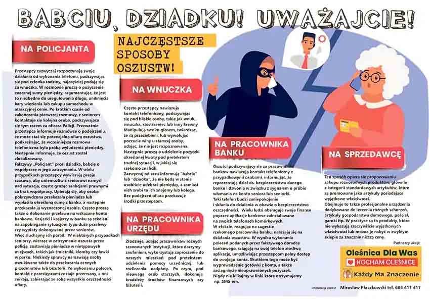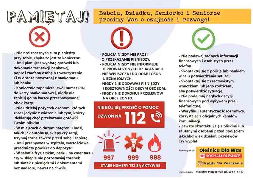 Tradycyjnie już z okazji Dnia Babci i Dziadka grupa radnych z klubu Oleśnica Dla Was startuje z akcją informacyjną dotyczącą bezpieczeństwa seniorów.