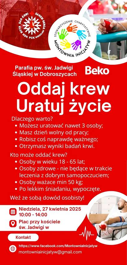 Szczegóły lokalizacji: Plac przy Kościele w Dobroszycach w godzinach 10-14. – Każda kropla ma znaczenie. Dołącz do nas i zostań bohaterem – apelują organizatorzy akcji.
