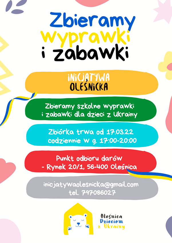 Wyprawki i zabawki należy dostarczać na adres Inicjatywa Oleśnicka – Rynek 20/1, Oleśnica codziennie w godzinach 17:00-20:00.