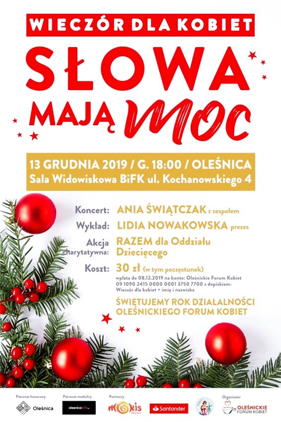 Już za miesiąc Oleśnickie Forum Kobiet będzie świętowało rok swojej oficjalnej działalności. Z tej okazji zaprasza wszystkie panie na Wieczór dla Kobiet, który odbędzie się 13 grudnia o godz. 18 w sali widowiskowej MOKiS.