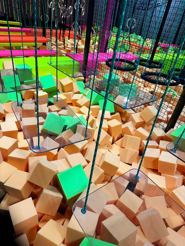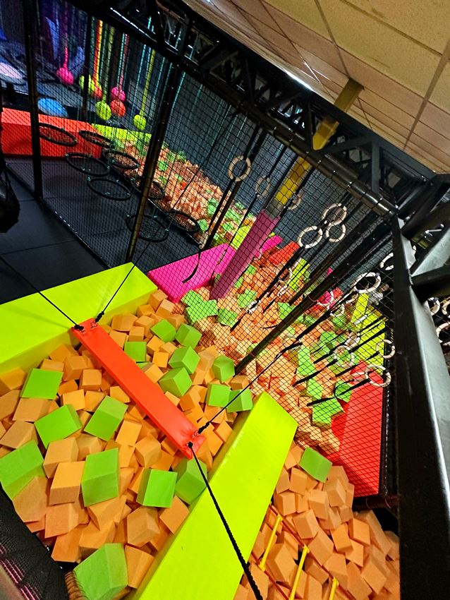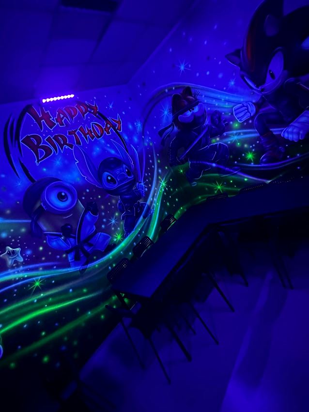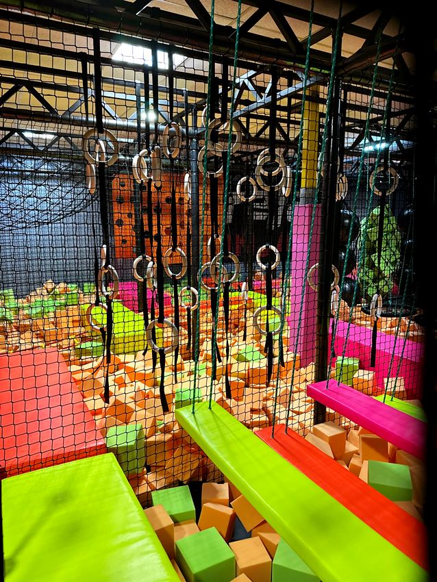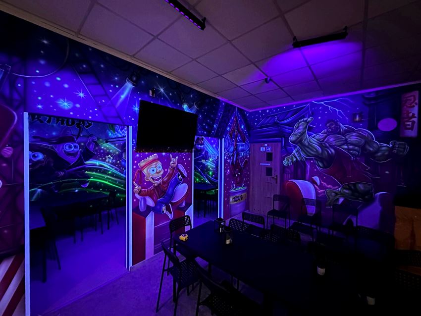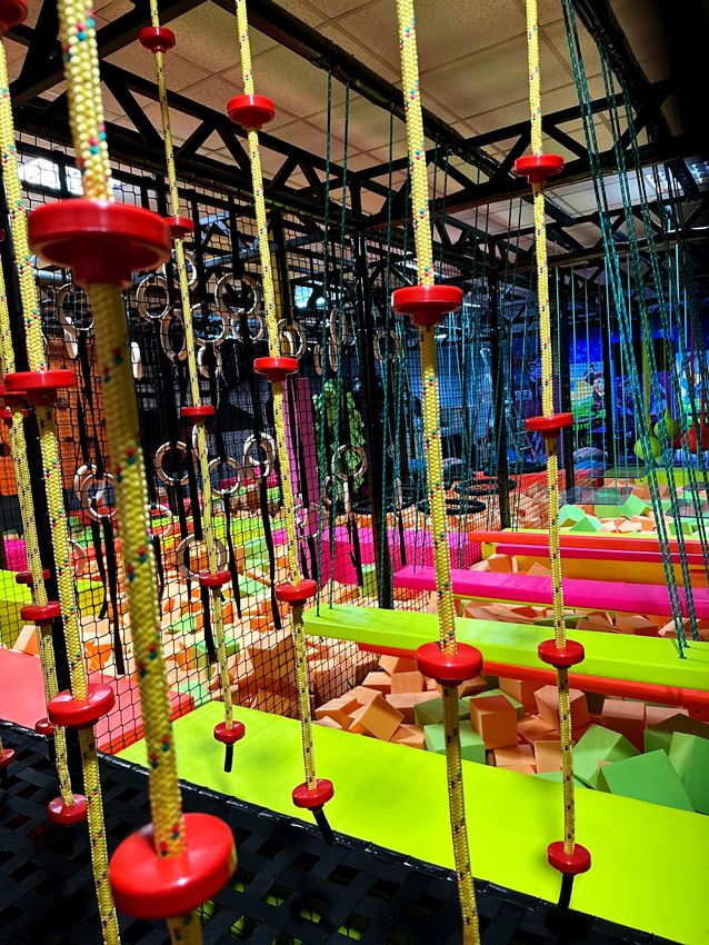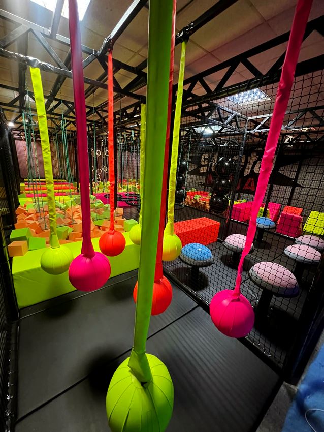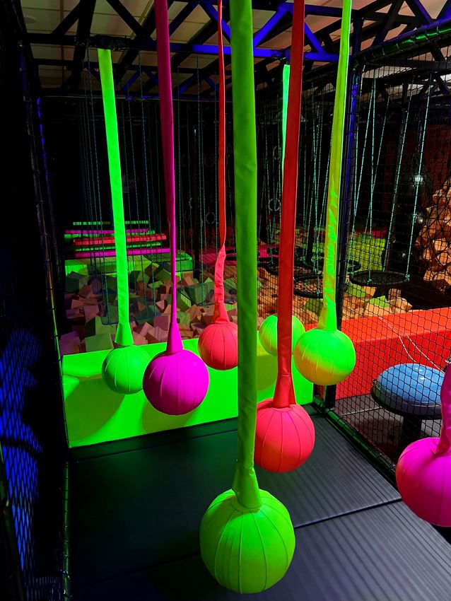 Strefa Ninja to również miejsce z unikalnym klimatem – cała sala została pomalowana w kolorach UV, co nadaje przestrzeni niepowtarzalny, futurystyczny wygląd i sprawia, że każda wizyta to wyjątkowa przygoda!