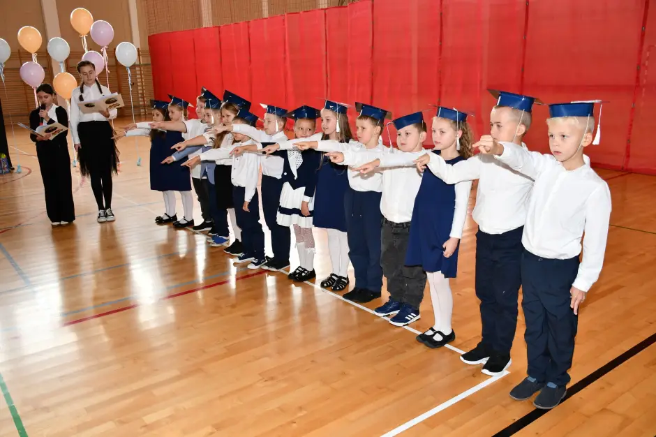 Pierwszoklasiści zaprezentowali program artystyczny pełen wierszy, piosenek i tańców, po czym nastąpił najbardziej uroczysty moment – ślubowanie i akt pasowania na ucznia, którego dokonała dyrektor szkoły. Tym samym najmłodsi oficjalnie dołączyli do społeczności szkolnej.