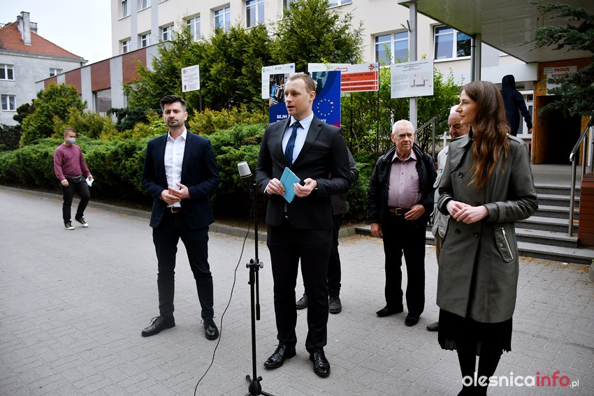 Dzisiaj przed budynkiem oleśnickiego szpitala odbyła się konferencja prasowa posłów Lewicy Krzysztofa Śmiszka i Agnieszki Dziemianowicz-Bąk dotycząca środków unijnych, które Polska ma otrzymać na odbudowę kraju po pandemii koronawirusa.
