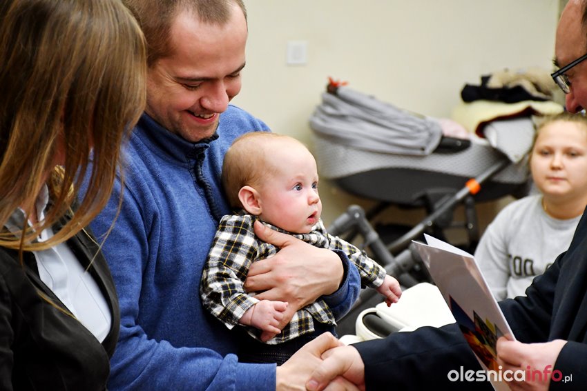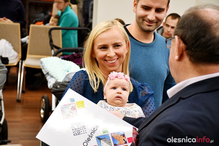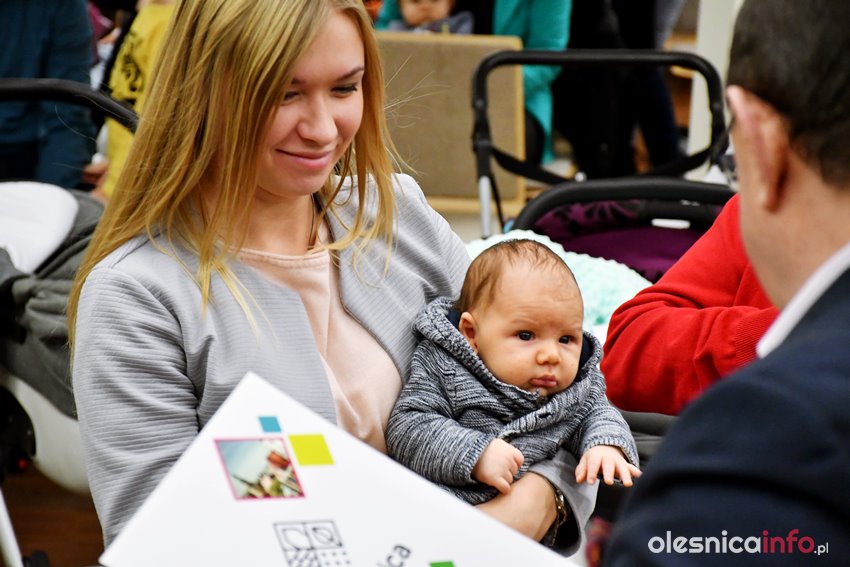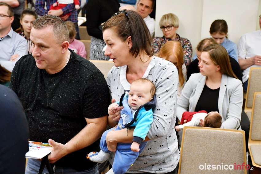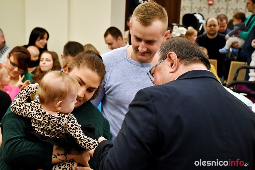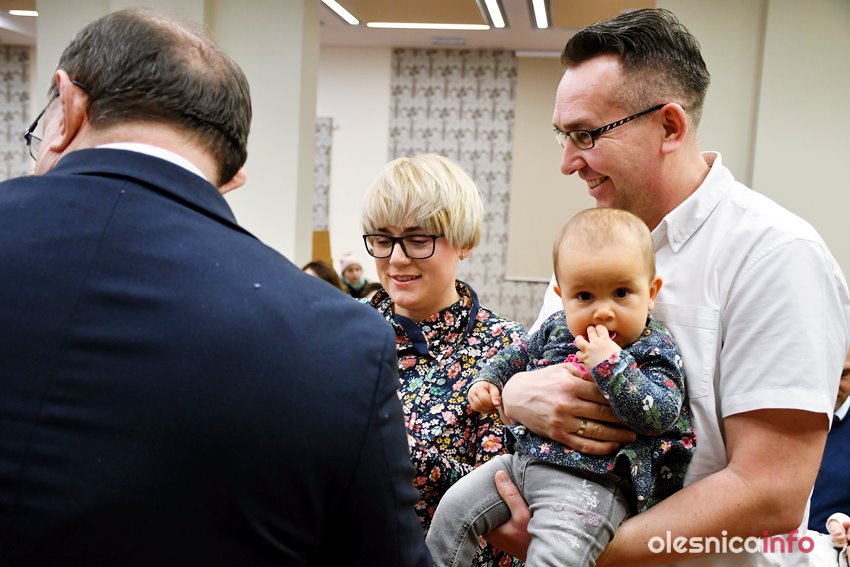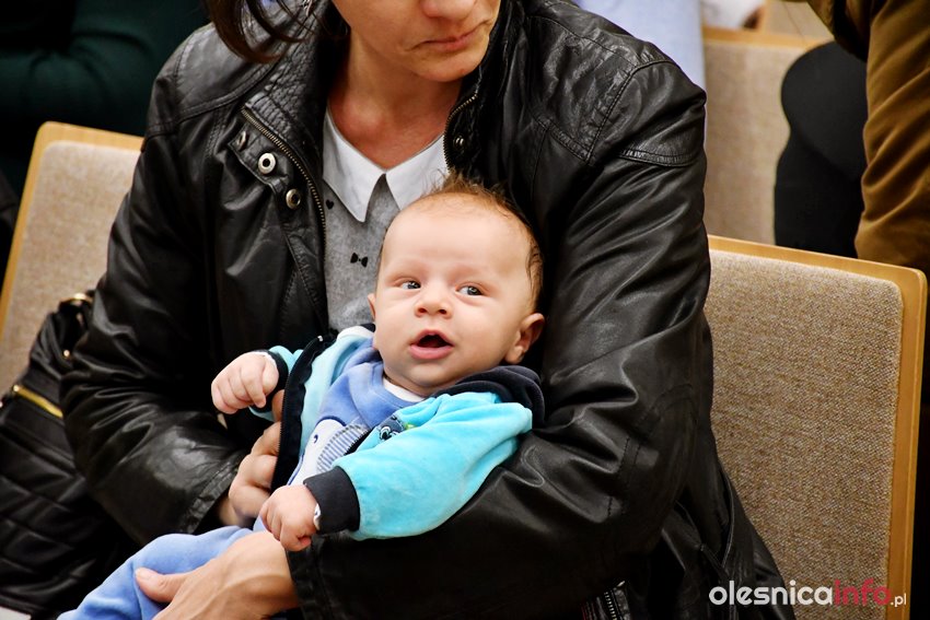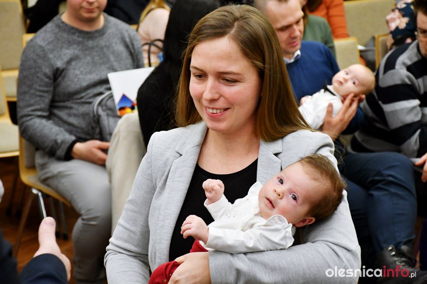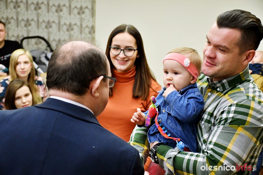 Były upominki i dla dzieci, i dla rodziców oraz gratulacje od burmistrza Jana Bronsia. który dziękował rodzicom za przybycie i za to, że utożsamiają się ze swoją małą ojczyzną – Oleśnicą. – Życzę, byście byli zadowoleni, jak Wasze dzieci rosną, a potem byli dumni z poziomu życia, jaki osiągają – mówił.