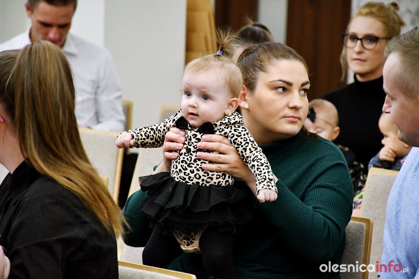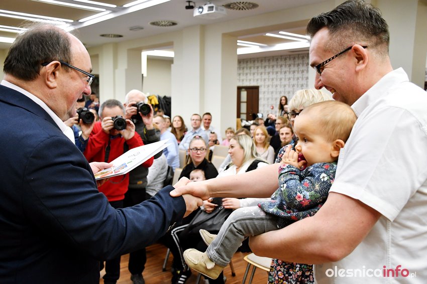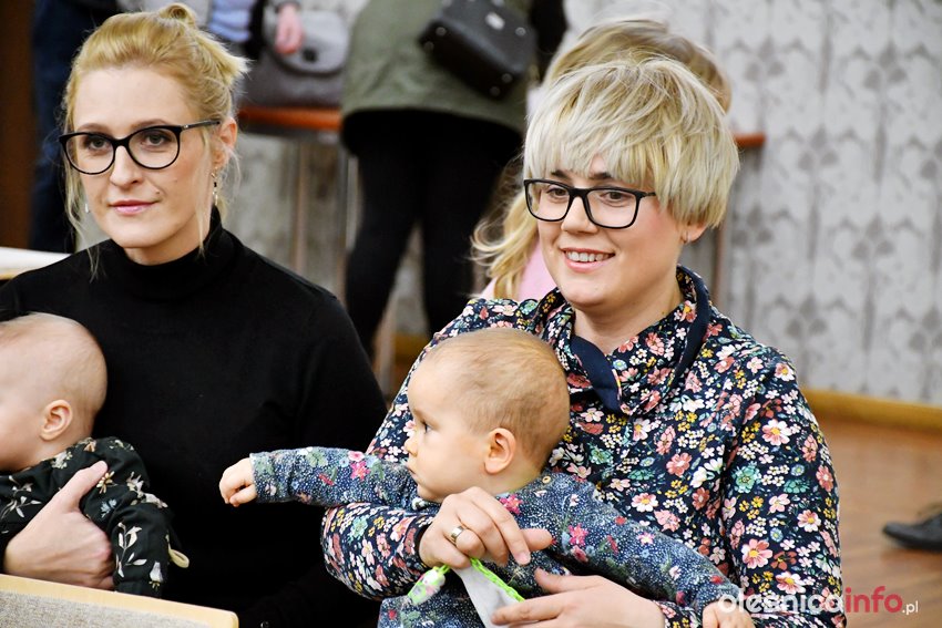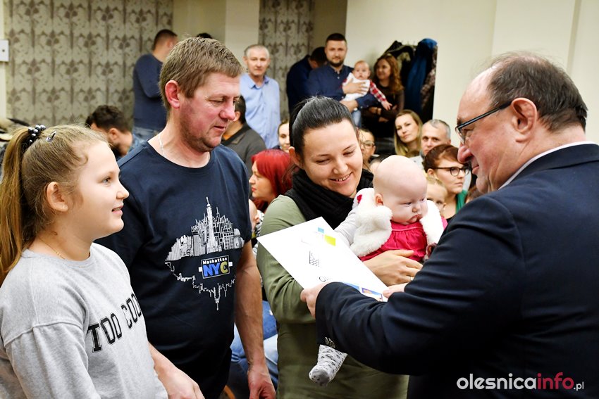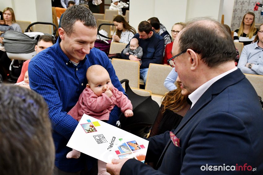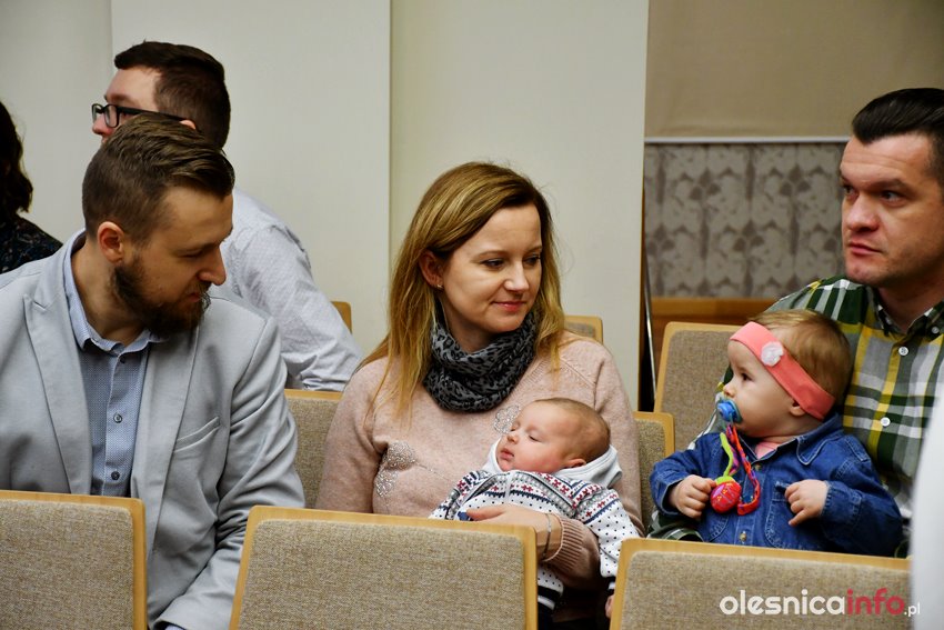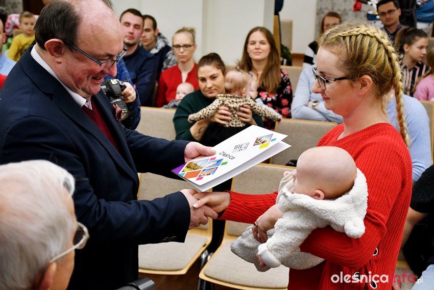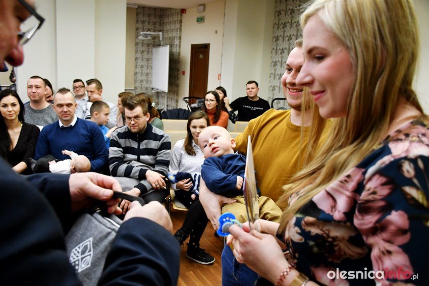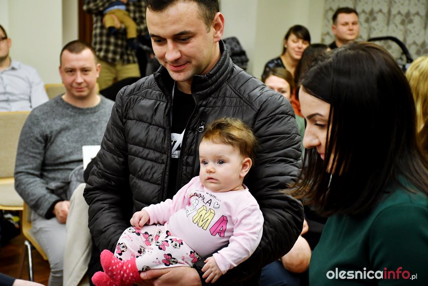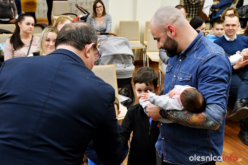 Były upominki i dla dzieci, i dla rodziców oraz gratulacje od burmistrza Jana Bronsia. który dziękował rodzicom za przybycie i za to, że utożsamiają się ze swoją małą ojczyzną – Oleśnicą. – Życzę, byście byli zadowoleni, jak Wasze dzieci rosną, a potem byli dumni z poziomu życia, jaki osiągają – mówił.