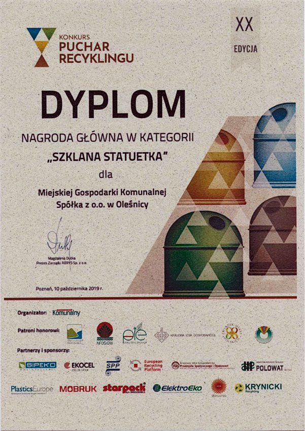 – Kapituła konkursu doceniła zaangażowanie i wyniki Miejskiej Gospodarki Komunalnej w Oleśnicy, przyznając jej trzy nagrody główna i dwa wyróżnienia oraz nagrodę specjalną od firmy „Starpack” producenta worków do selektywnej zbiórki odpadów – informuje oleśnicki magistrat.