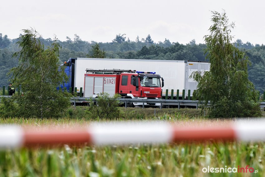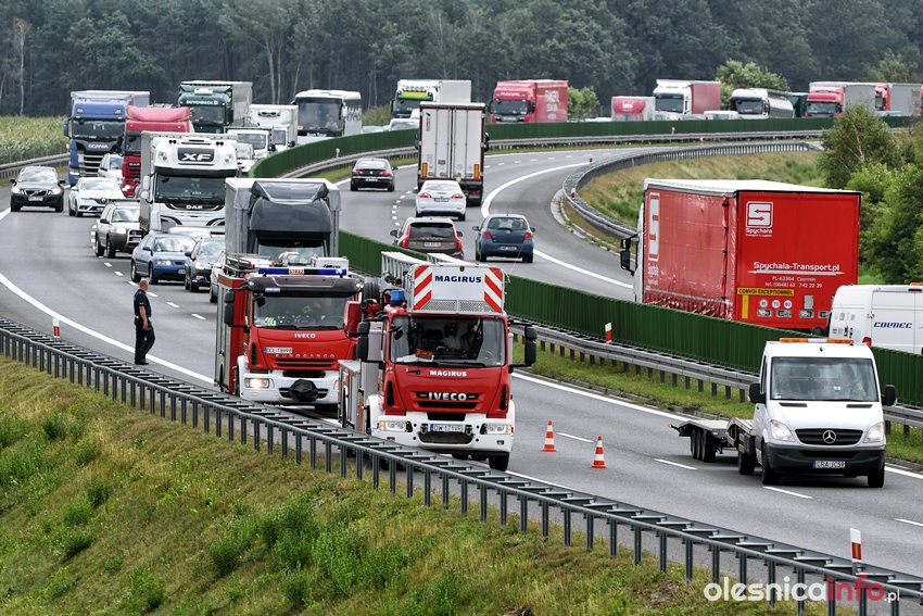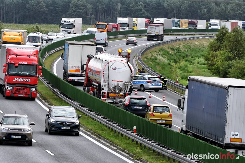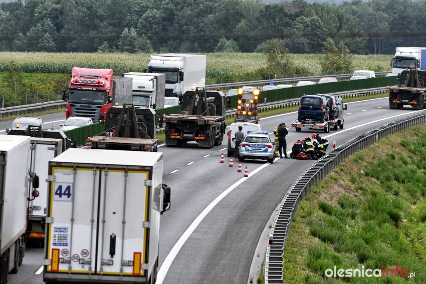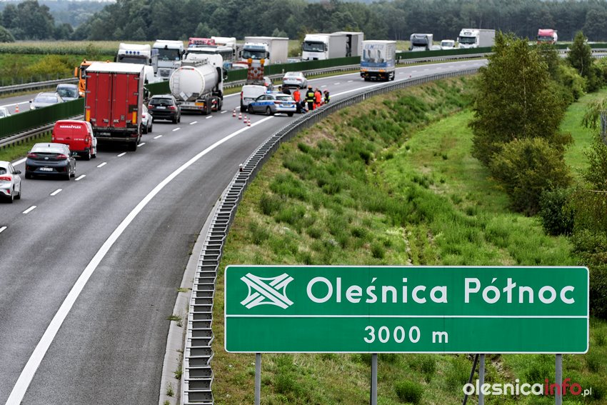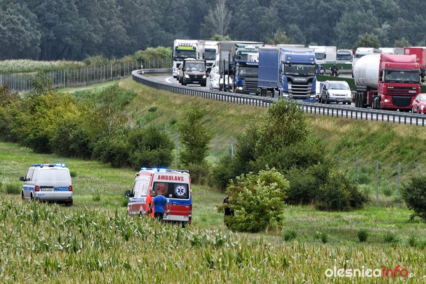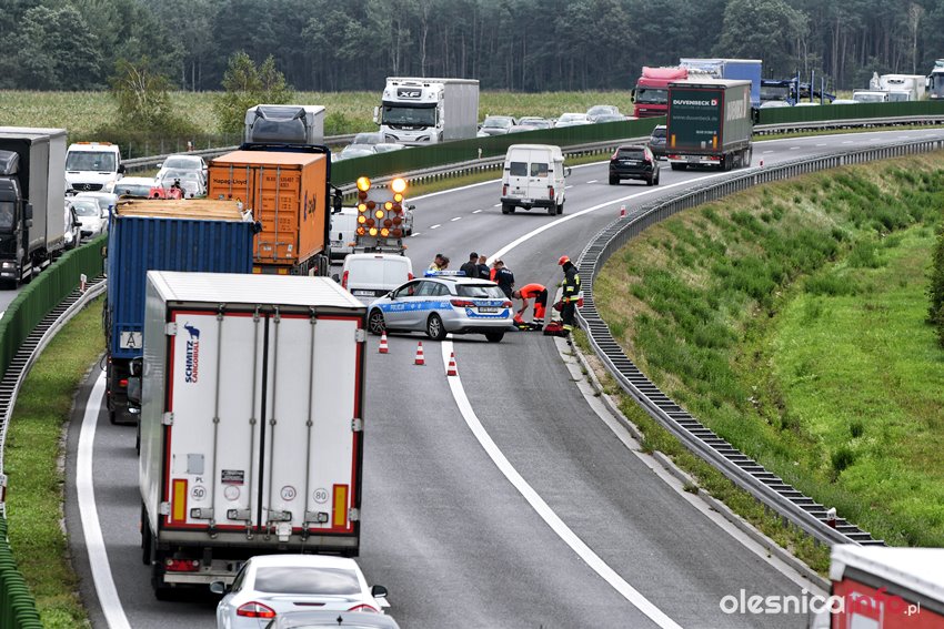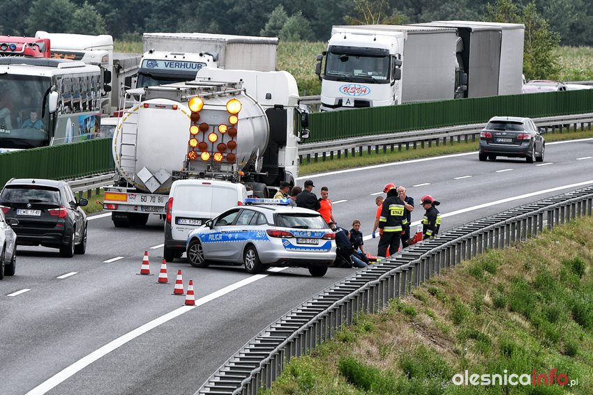 Mężczyzna został przejęty przez służby. Ratownicy udzielają mu pomocy. Droga na Wrocław jest częściowo zablokowana. Ruch odbywa się jednym pasem.