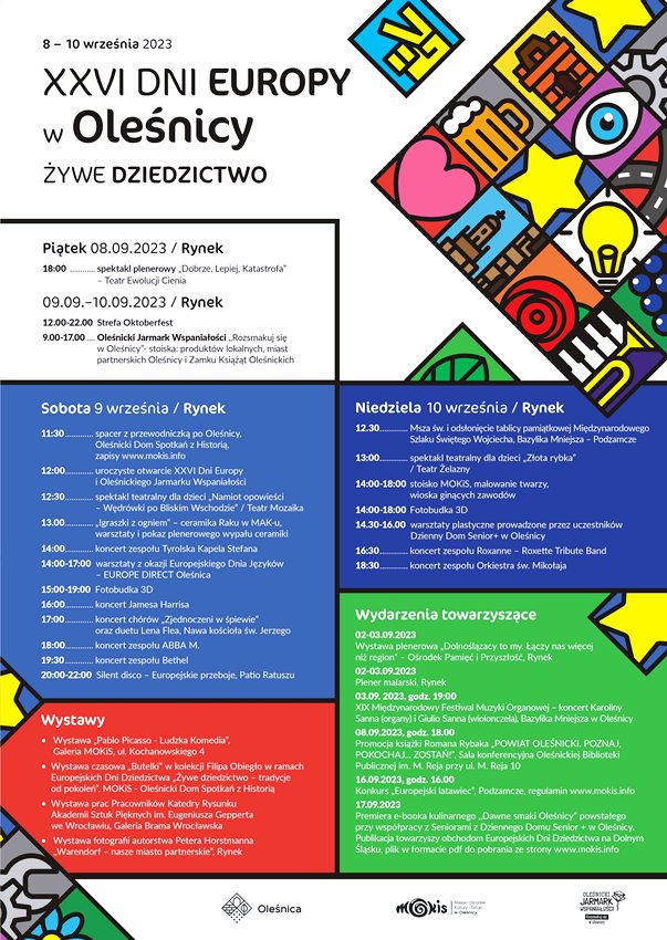 Przed nami już XXVI edycja jednego z najważniejszych wydarzeń kulturalnych w Oleśnicy – Dni Europy. W tym roku zapraszamy wszystkich do udziału w imprezach składających się na to wydarzenia w dniach 08.09.2023 – 10.09.2023.