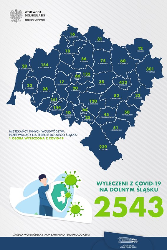 – Szanowni Państwo, miło mi poinformować, że na terenie województwa dolnośląskiego wśród osób, u których potwierdzono zakażenie koronawirusem jest 4 kolejnych mężczyzn (1 młody, 1 w średnim wieku, 2 w wieku z grupy ryzyka), których ponowne wyniki testu laboratoryjnego okazały się negatywne. Oznacza to, że pacjenci są zdrowi. W sumie liczba osób wyleczonych z COVID-19 w województwie dolnośląskim: 2543 – poinformował wojewoda dolnośląski.