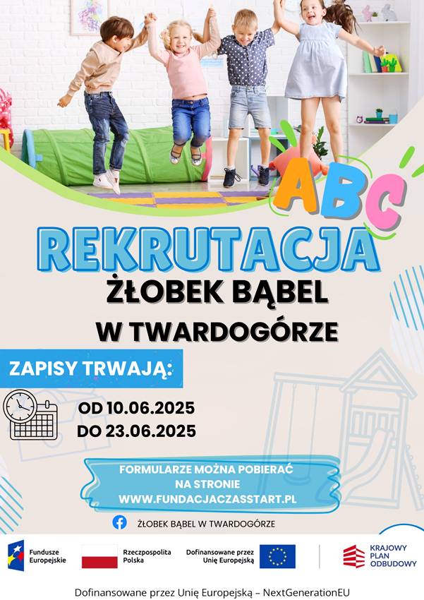 Rodzice, którzy chcą zapisać swoje dzieci do żłobka, powinni pamiętać o terminach – rekrutacja potrwa od 10 do 23 czerwca. Wszystkie niezbędne formularze i dokumenty rekrutacyjne dostępne są do pobrania na stronie Fundacji: https://fundacjaczasstart.pl