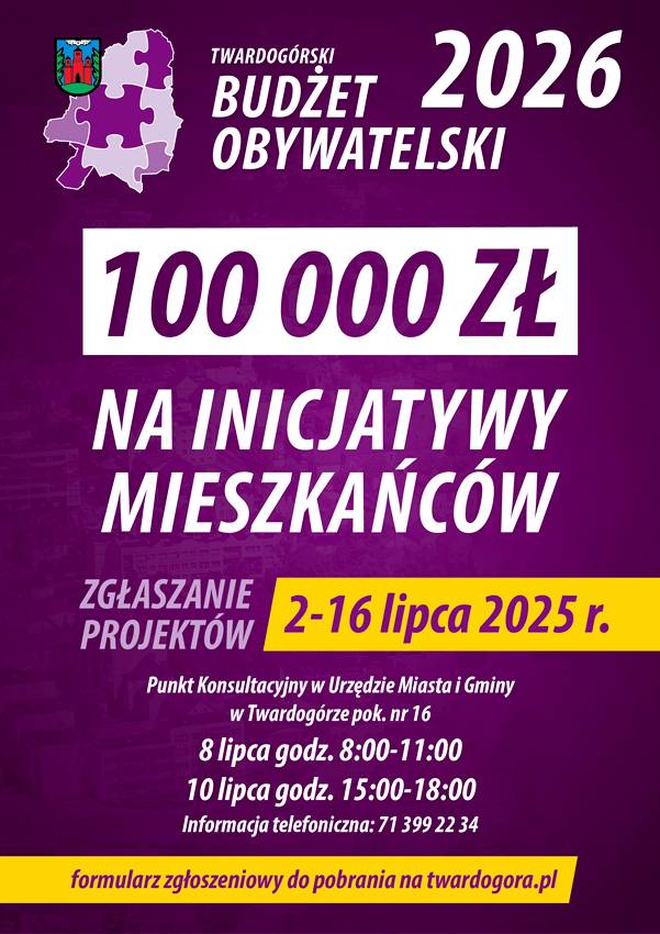 W tegorocznej edycji mieszkańcy, którzy ukończyli 16 lat zgłoszą projekty inwestycyjne bądź remontowe, zlokalizowane na terenie miasta Twardogóra oraz społeczne (np. sportowe, kulturalne lub artystyczne) zlokalizowane na terenie całej gminy. Wypełnione formularze zgłoszeniowe wraz z listą osób popierających projekt można złożyć osobiście w pok. nr 10 UMiG w Twardogórze, przesłać do urzędu drogą pocztową bądź przez ePUAP. Tylko pozytywnie zweryfikowane projekty przez Zespół ds. Twardogórskiego Budżetu Obywatelskiego zostaną poddane głosowaniu mieszkańców, w dniach 4-18 września 2025 r. Projekty z największą liczbą głosów zostaną ujęte w projekcie uchwały budżetowej na rok 2026.