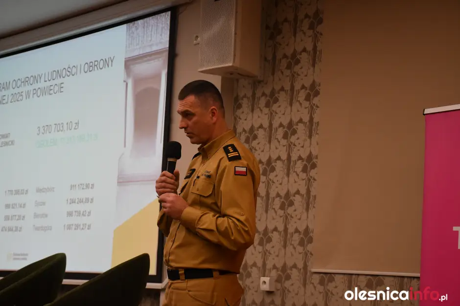 Starosta Wioletta Efinowicz mówiła o tym, jak powiat wydał pierwsze pieniądze przekazane przez rząd na ochronę ludności. To kwota ponad 3,3 mln zł, która została wydana m.in. na zakup drona, agregatów, namiotu pneumatycznego, nagrzewnicy, masztów oświetleniowych, mobilnego systemu uzdatniania wody, zbiornika na olej napędowy oraz remont magazynu, w którym wszystkie te urządzenia będą przechowywane. – W przyszłym roku ta kwota będzie podobna – mówiła starosta, wyjaśniając, że wśród zakupów planowanych na 2026 rok będzie zakup ambulansu z wyposażeniem, a także wyposażenie doraźnych miejsc schronienia w jednostkach powiatowych (chodzi np. o szkoły). – Najważniejsza rzecz – chcemy wykonać dokumentację projektową podziemnego parkingu z funkcją schrony przy szpitalu w Oleśnicy – powiedziała Wioletta Efinowicz.