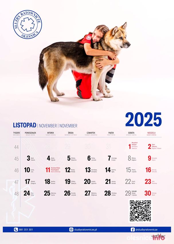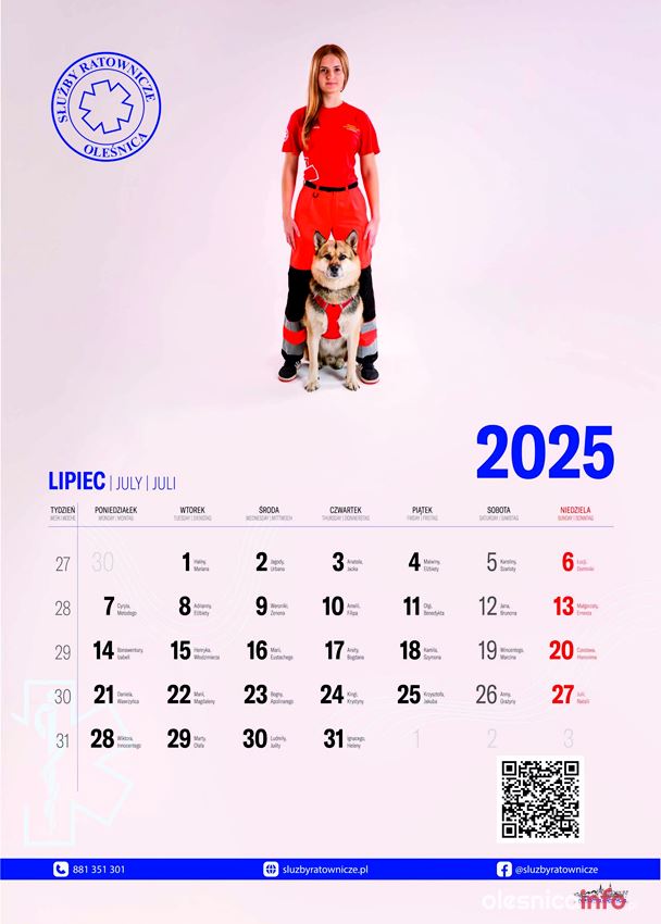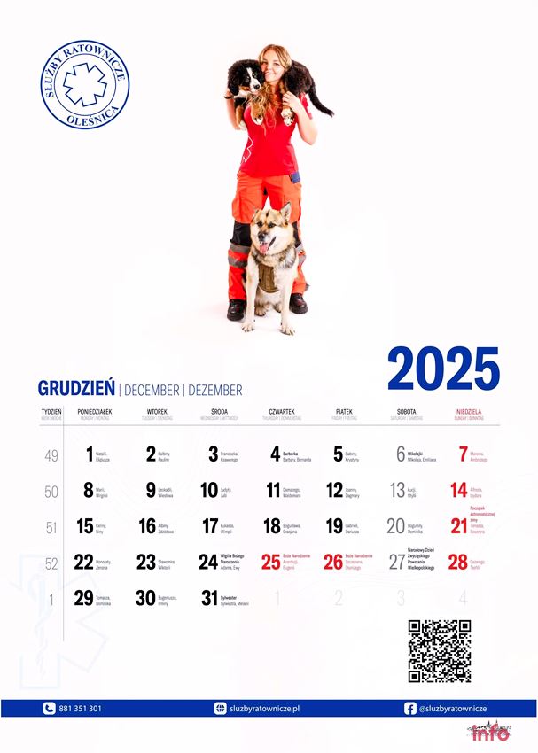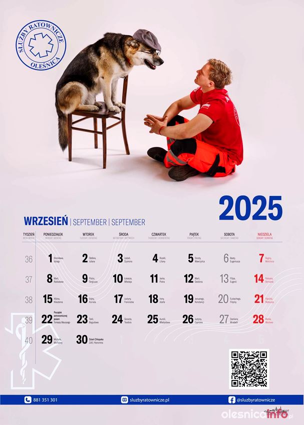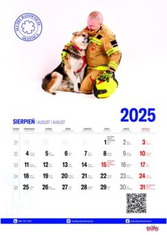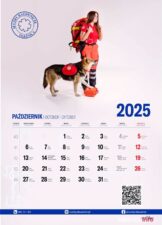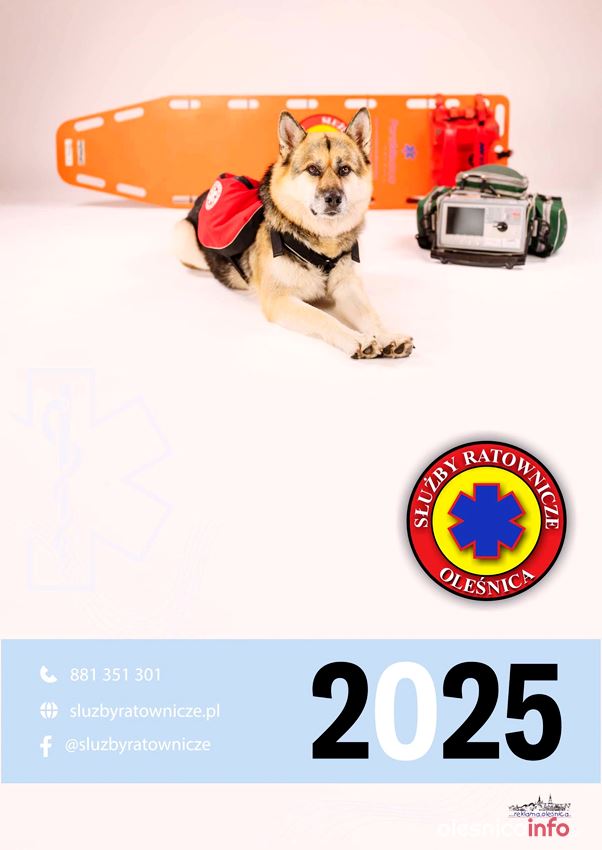 Oleśnickie Służby Ratownicze zaprezentowały kalendarz na 2025 rok. Na zdjęciach, wraz z psem Hasko, występują ratownicy, a zdjęcia wykonał Jarosław Krawczak.