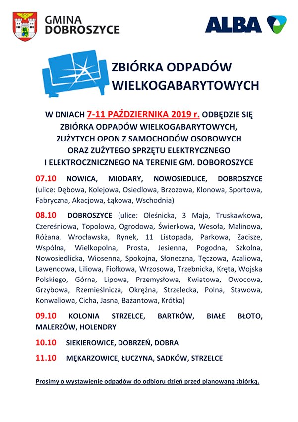 7 października w gminie Dobroszyce ruszy zbiórka odpadów wielkogabarytowych, zużytych opon, sprzętu elektrycznego i elektronicznego. Akcja potrwa do 11 października. Sprawdź, kiedy zaplanowano ją w Twojej miejscowości.
