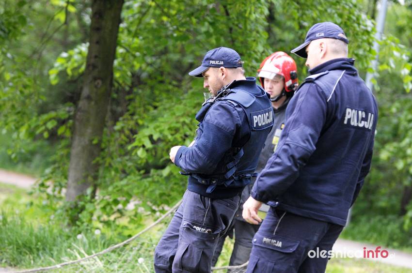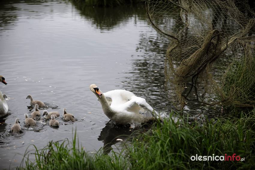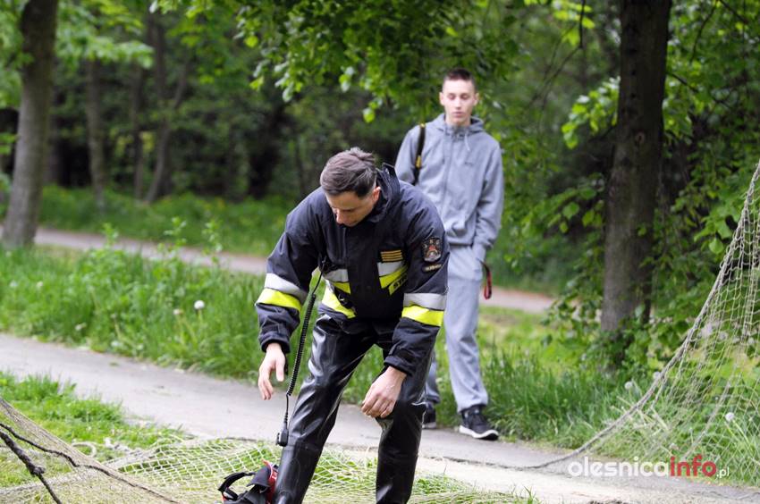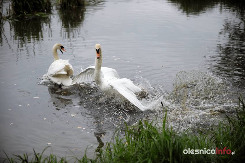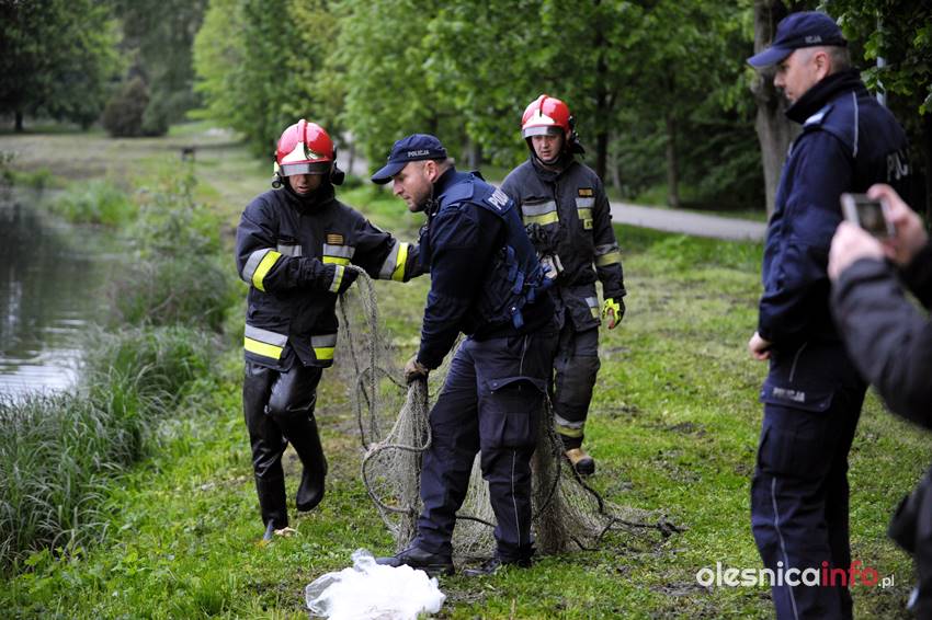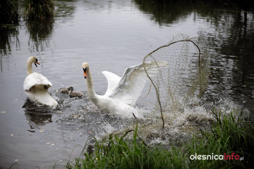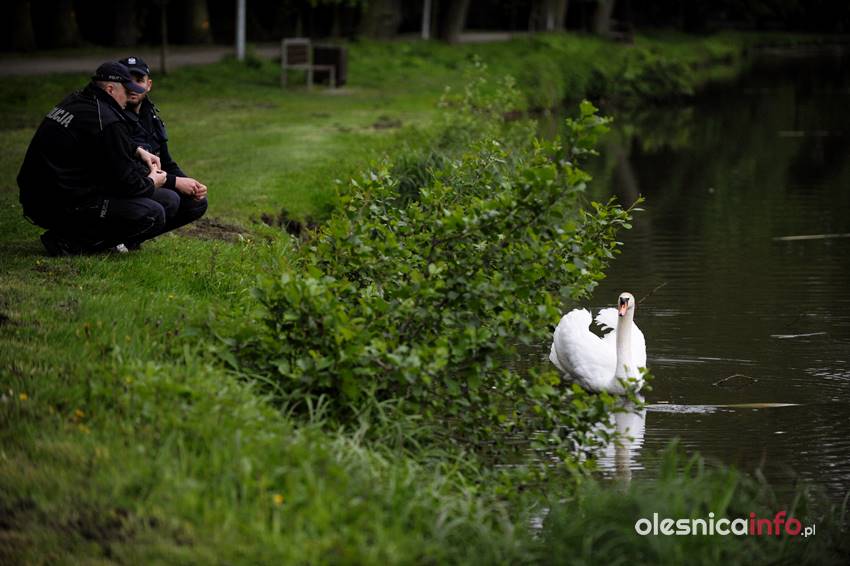 Po kilkunastu minutach od pierwszej interwencji strażacy podjęli kolejną próbę wyciągnięcia łabędzia z wody. Akcja nad oleśnickim stawem trwała kilkanaście minut. Strażacy próbowali zarzucić sieć i w ten sposób wyciągnąć łabędzia z wody. Ptak podpływał, gdy przy brzegu stali policjanci, odpływał, gdy pojawiali się strażacy z siecią. Łabędzia próbowano też skusić chlebem, ale bezskutecznie. – Widać, że mu ta żyłka przeszkadza, bo skubie nogę, ale pomóc sobie nie da – komentowali oleśniczanie, którzy przyglądali się działaniom służb.