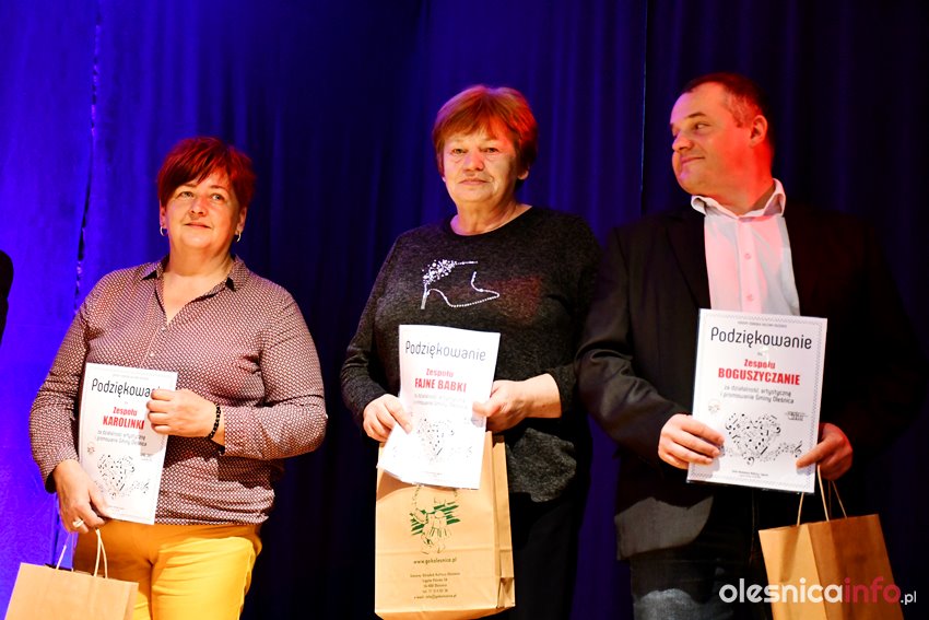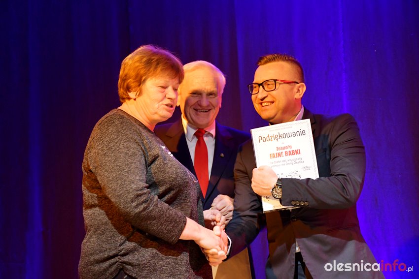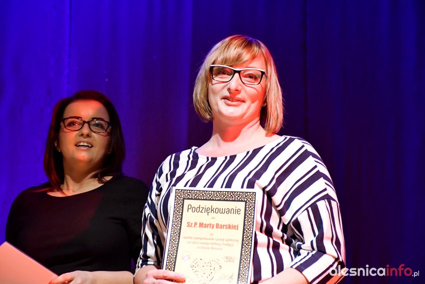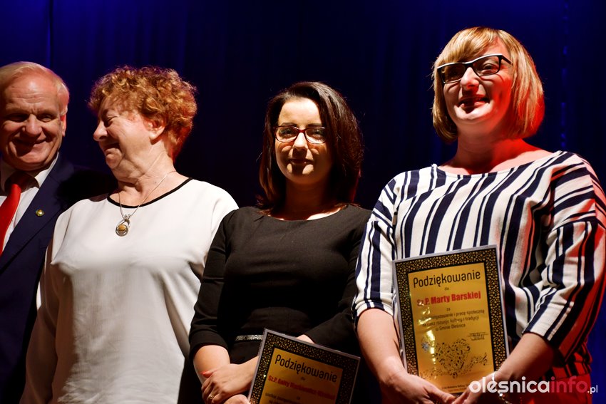 Najaktywniejszych działaczy zapraszała na scenę Monika Małobęcka. Pojawiali się na niej kierownicy zespołów, opiekunowie świetlic, kierownicy drużyn sportowych. Także radni i urzędnicy związani z kulturą. Specjalne podziękowania trafiły do przewodniczącego Rady Gminy Oleśnica Tadeusza Kunaja oraz wójta Marcina Kasiny, który dziękował wszystkim działaczom i wręczał im upominki i dyplomy.