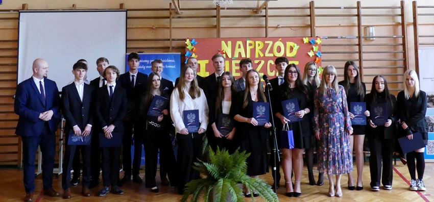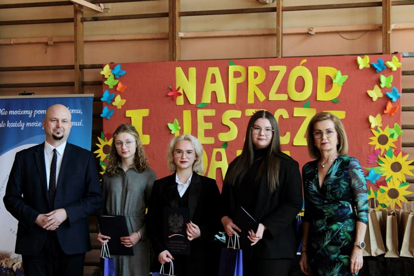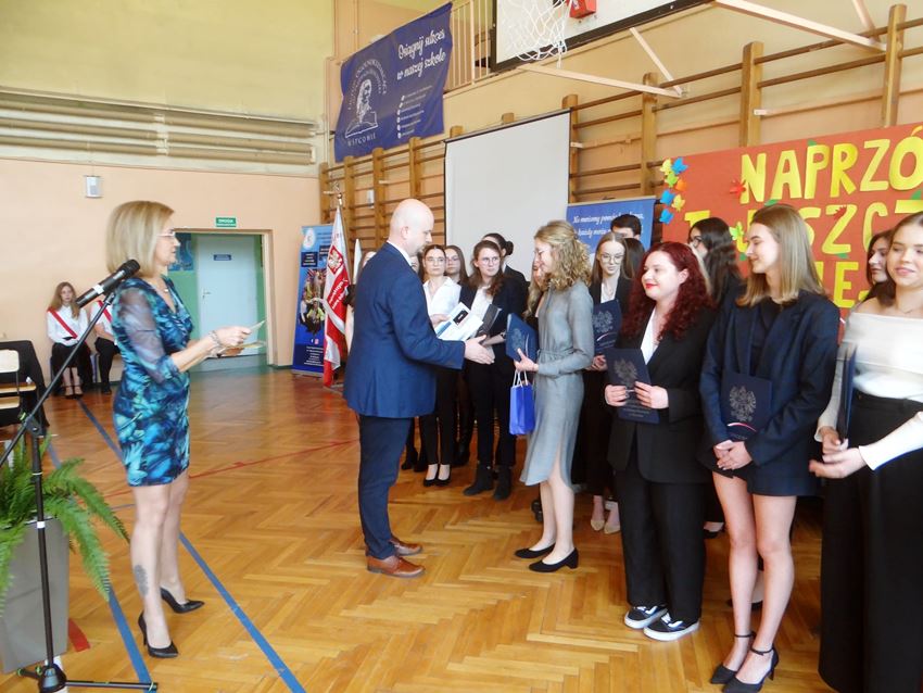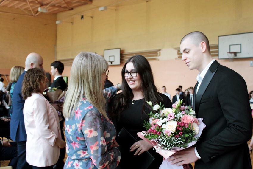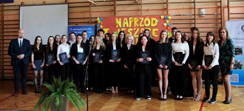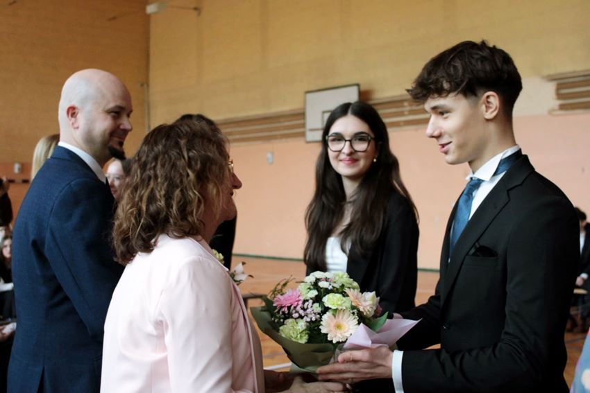 Absolwenci z nieskrywaną radością i dumą odbierali z rąk swoich wychowawczyń Jolanty Dolaty i Ewy Michałczyk świadectwa ukończenia szkoły. Najlepsi uczniowie otrzymali nagrody za wysokie wyniki w nauce, wzorową frekwencję, wyróżniającą działalność w szkolnym kole wolontariackim „Serce na dłoni” oraz aktywność sportową. Podczas uroczystości nie obyło się bez wzruszeń i pięknych słów podziękowań dla całego grona pedagogicznego za wsparcie i wyrozumiałość w czasie czteroletniej nauki. Trzecioklasiści oraz Samorząd Uczniowski przygotowali dla starszych kolegów niespodzianki i szczere życzenia jak najlepszych wyników na maturze.